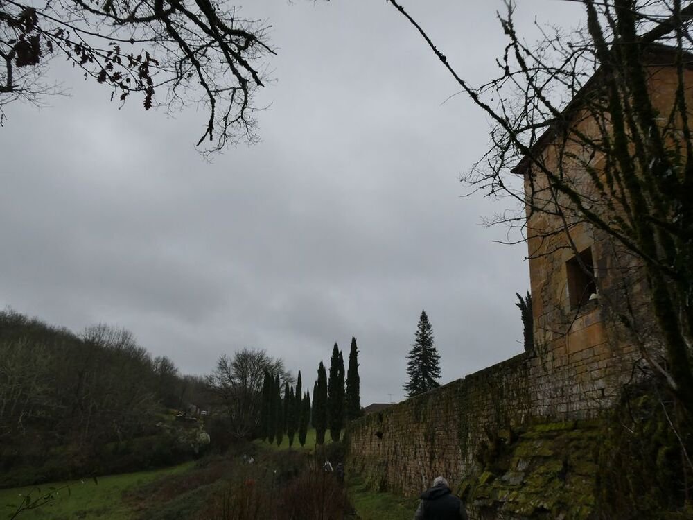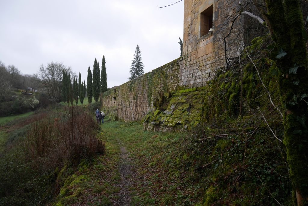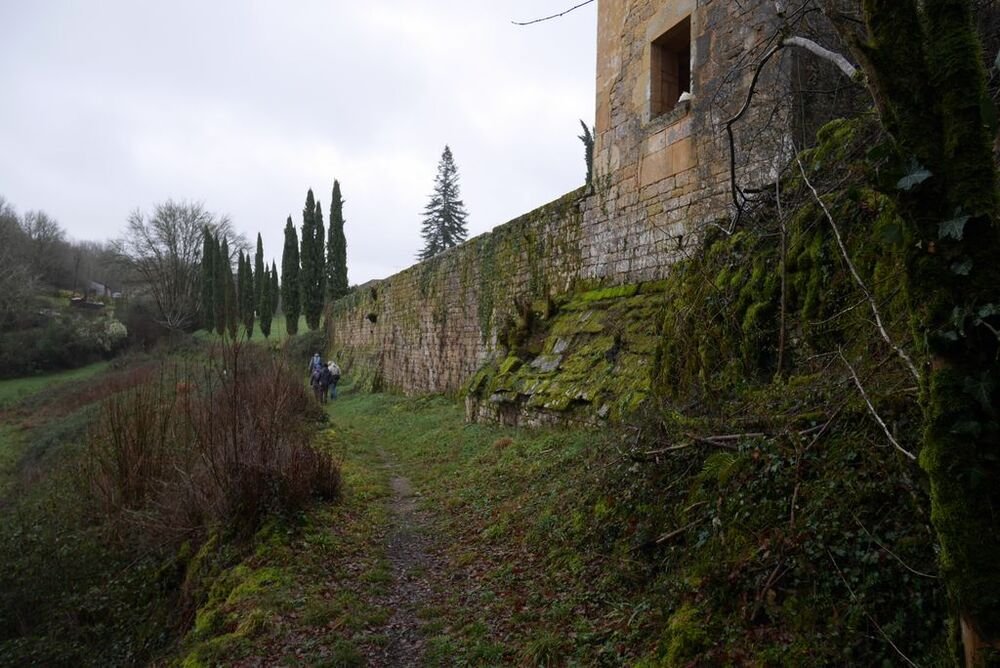 De l’église Saint Louis, nous contournons la bastide par son ancien chemin de ronde, longeant le mur d’enceinte et une curieuse garriotte chevelue, avant de descendre par une sente rendue glissante par la pluie et d’atteindre la D 673 puis de franchir la Thèze.