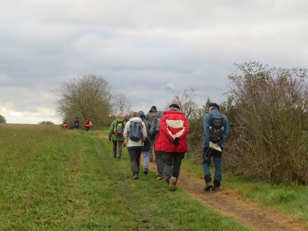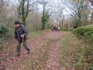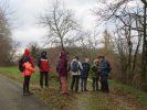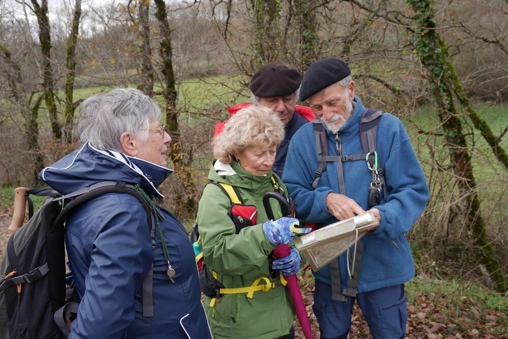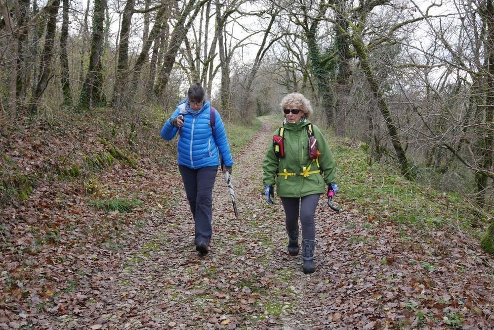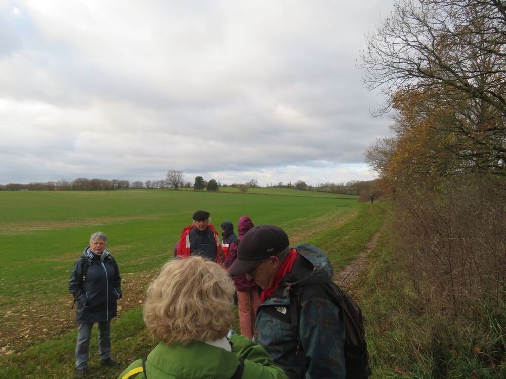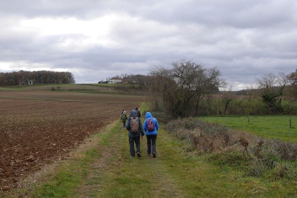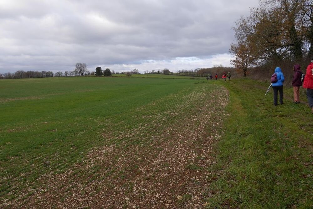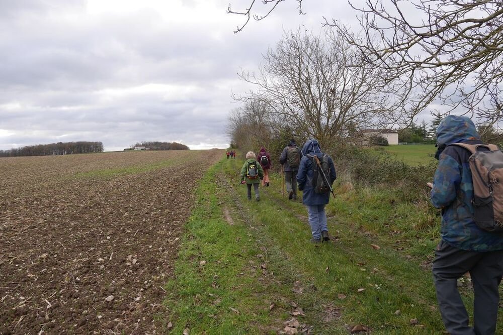 Sous la conduite experte de Marie Hélène et Evelyne, bien emmitouflés dans nos habits hivernaux, fouettés par une brise fraiche, nous quittons, sous un ciel chargé de nuages, le centre bourg pour un périple de 6 kms et un dénivelé de 45 m, empruntant plein sud le CD 44, avant d’obliquer sud-ouest vers la ferme de Capela et de remonter par une sente herbeuse bordée de magnifiques chênes vers les lieux-dits « Bascoul » et « Loucarde ».