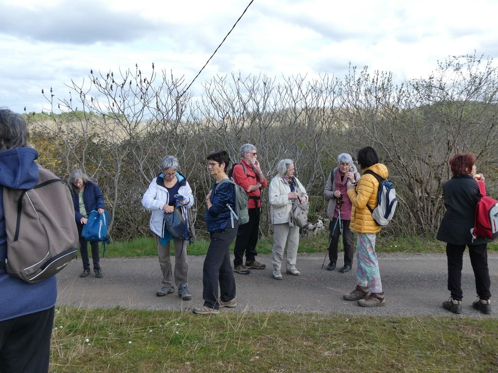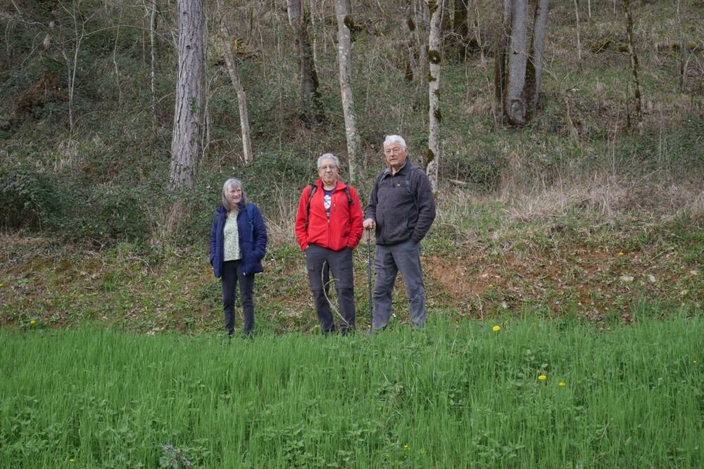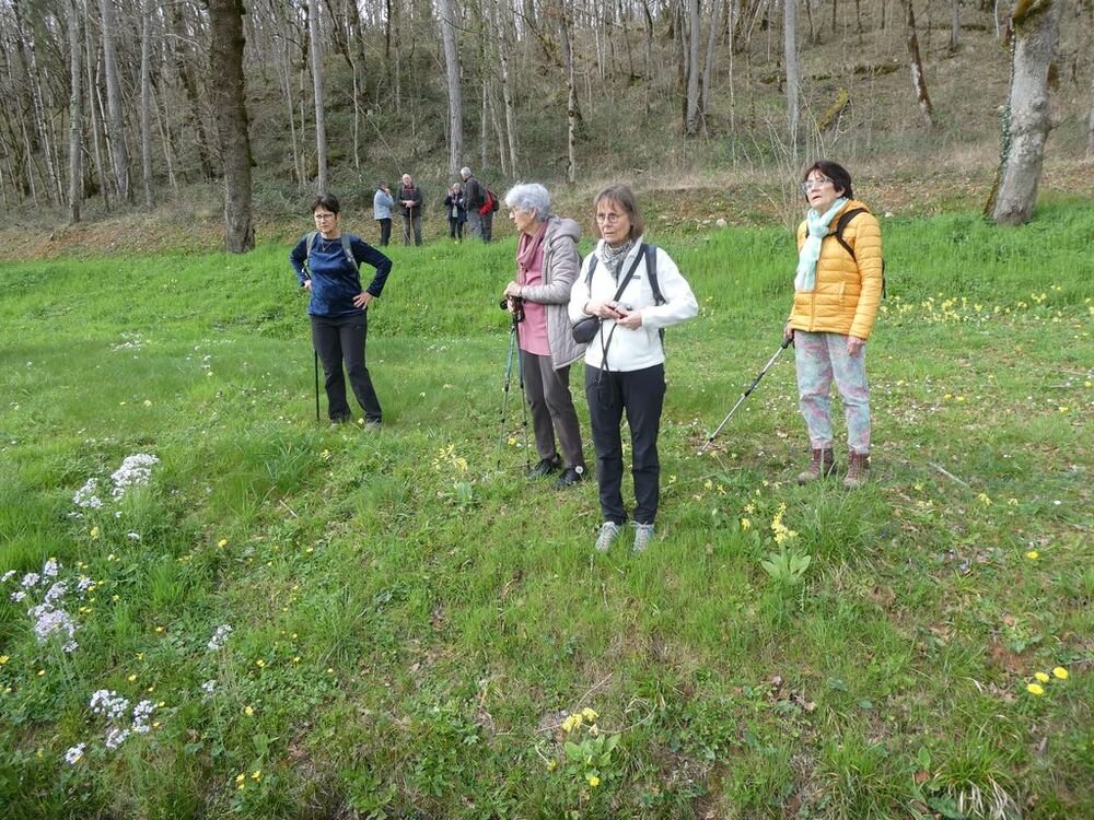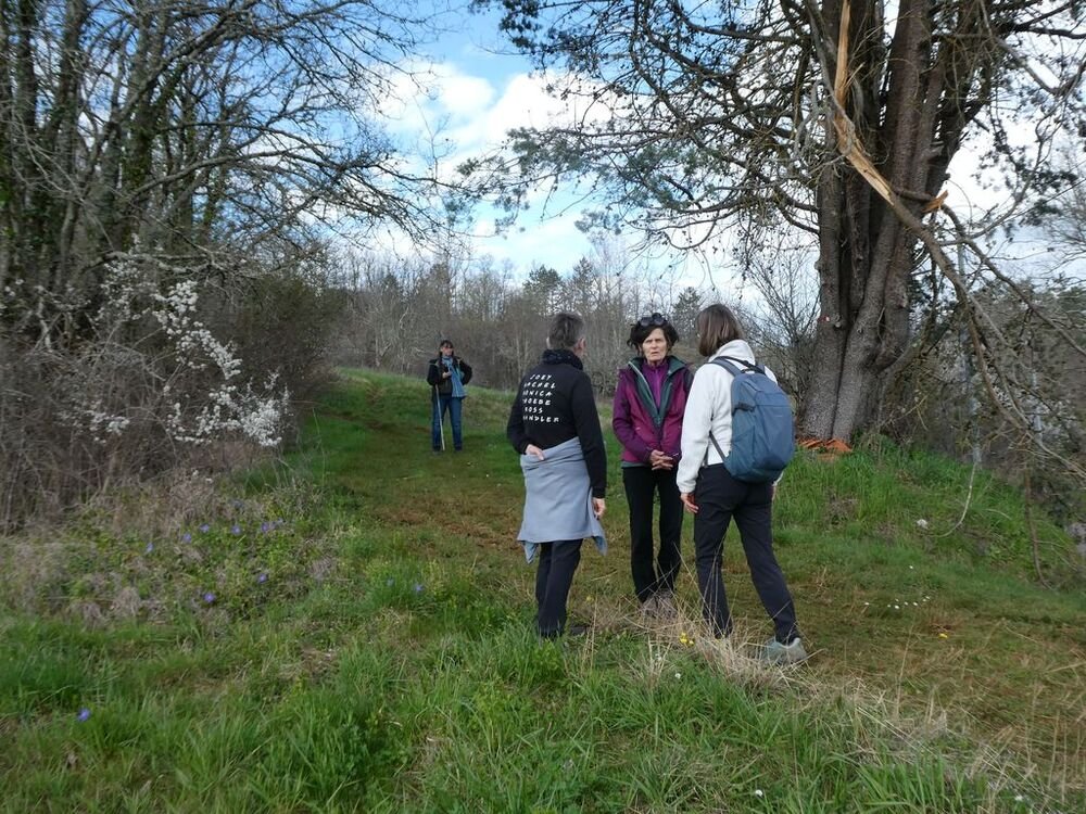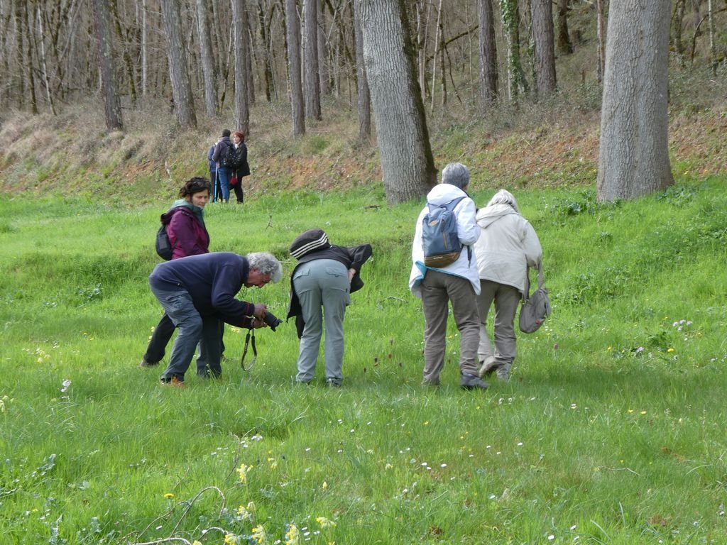 Nous sommes 20 à profiter de la balade. Nous descendons le long d’un sentier bordé de pervenches sauvages, toutes fraîches.