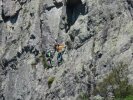 Après être passés auprès d’étangs et de tourbières, nous entamons la montée vers le col de Falimont qui culmine à 1300 m. Sur 1 km, nous avalons un dénivelé de 300 m ! Au cours de cette rude montée, nous avons à notre droite la falaise verticale de la Martinswand (mur de Martin) où évoluent deux amateurs d’escalade que l’objectif de l’appareil photo nous permet d’apercevoir d’un peu plus près. Vertigineux ! ! !