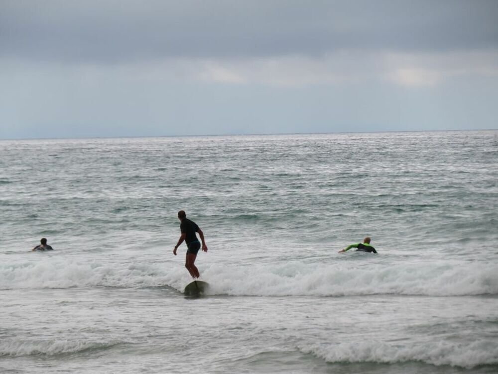 Les sportifs sont là, le long de ces plages réputées pour leurs « rouleaux » : mais aujourd’hui l’océan n’est guère généreux, ce qui n’empêche pas les surfeurs de s’en donner à cœur joie en chevauchant les quelques vaguelettes qui parviennent jusqu’au rivage.